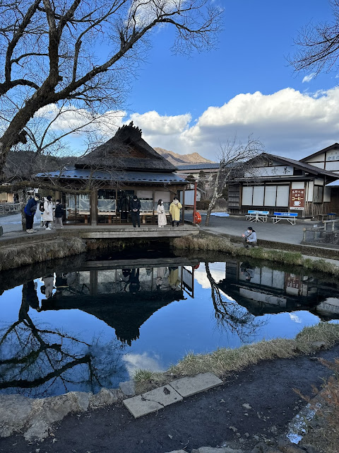 The village is mostly dotted with little streams, ponds, and little bridges/walkways. There are water wheels that are fascinating to watch as they work, and a Mt. Fuji viewpoint (although there are loads of spots where Mt. Fuji is picturesquely visible). There are several cafés and a big central souvenir shop/covered market, inside of which is a natural rock with flowing where you can refill your own water bottles with fresh water from Mt. Fuji's melted snow caps! Plus, there is a market street where vendors sell all varieties of food and items-- from candied fruits and the usual takoyaki and okonomiyaki to quirky little Buddha statues and powered crystals!