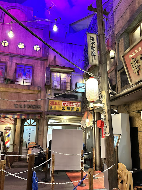 Deciding to take a little walk, hoping to forcibly speed up our metabolism, we discovered a little alleyway that goes around the food court dotted with more shops and themed décor. It was giving off very strong retro-Tokyo feels. There is a small candy store that sells classic dagashi snacks, ramune, small toys, and agepan which is a roll that is popular as a Japanese school lunch snack.